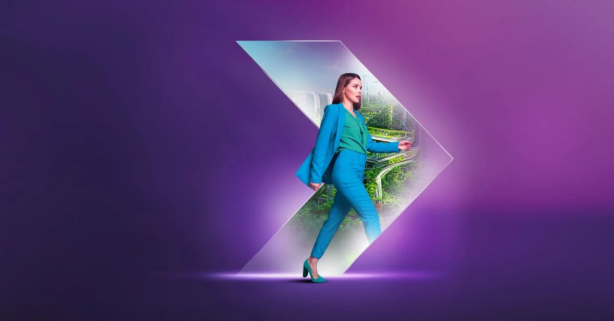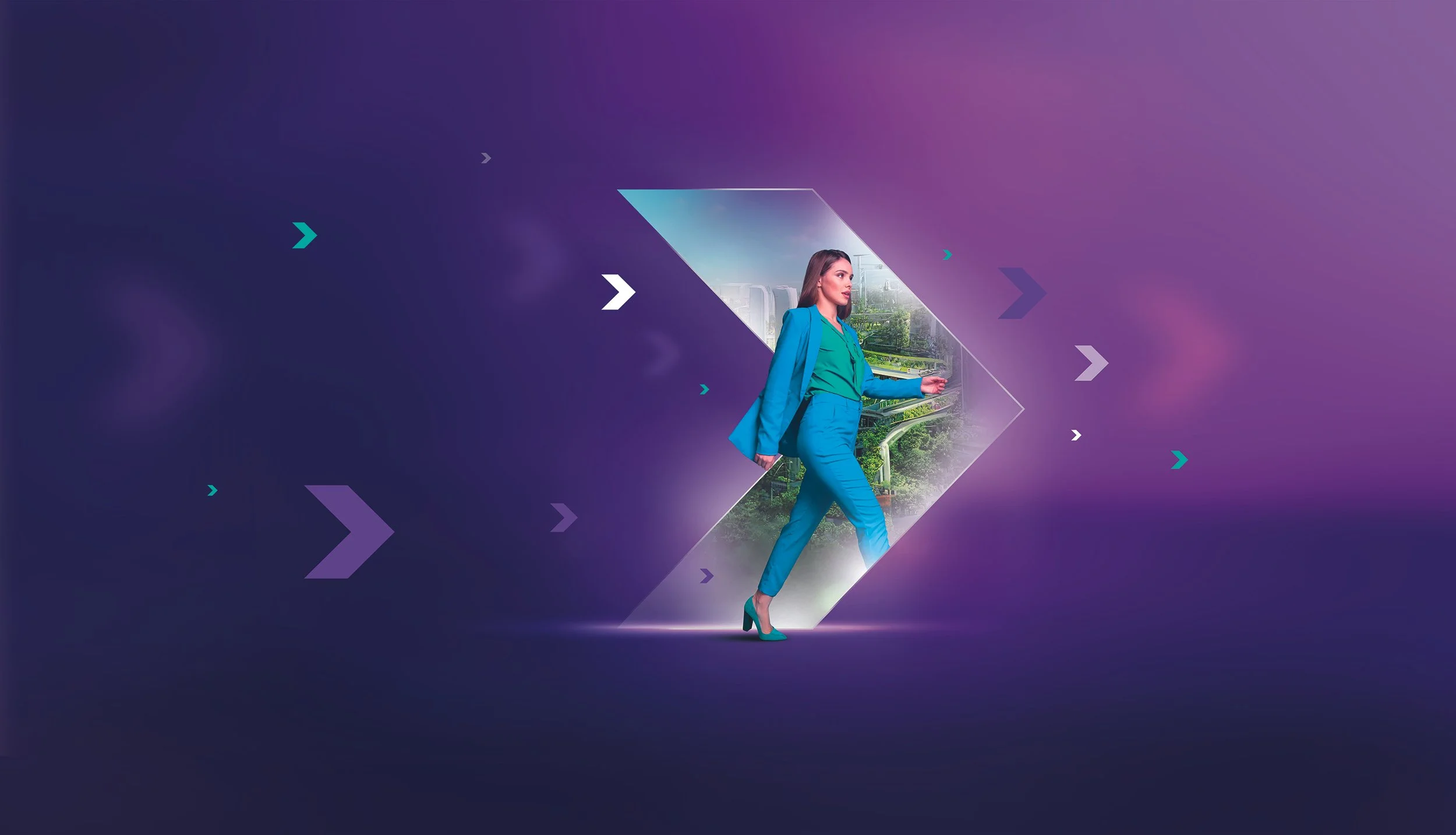 The main key visual settled on a business woman walking through into a futuristic city landscape.