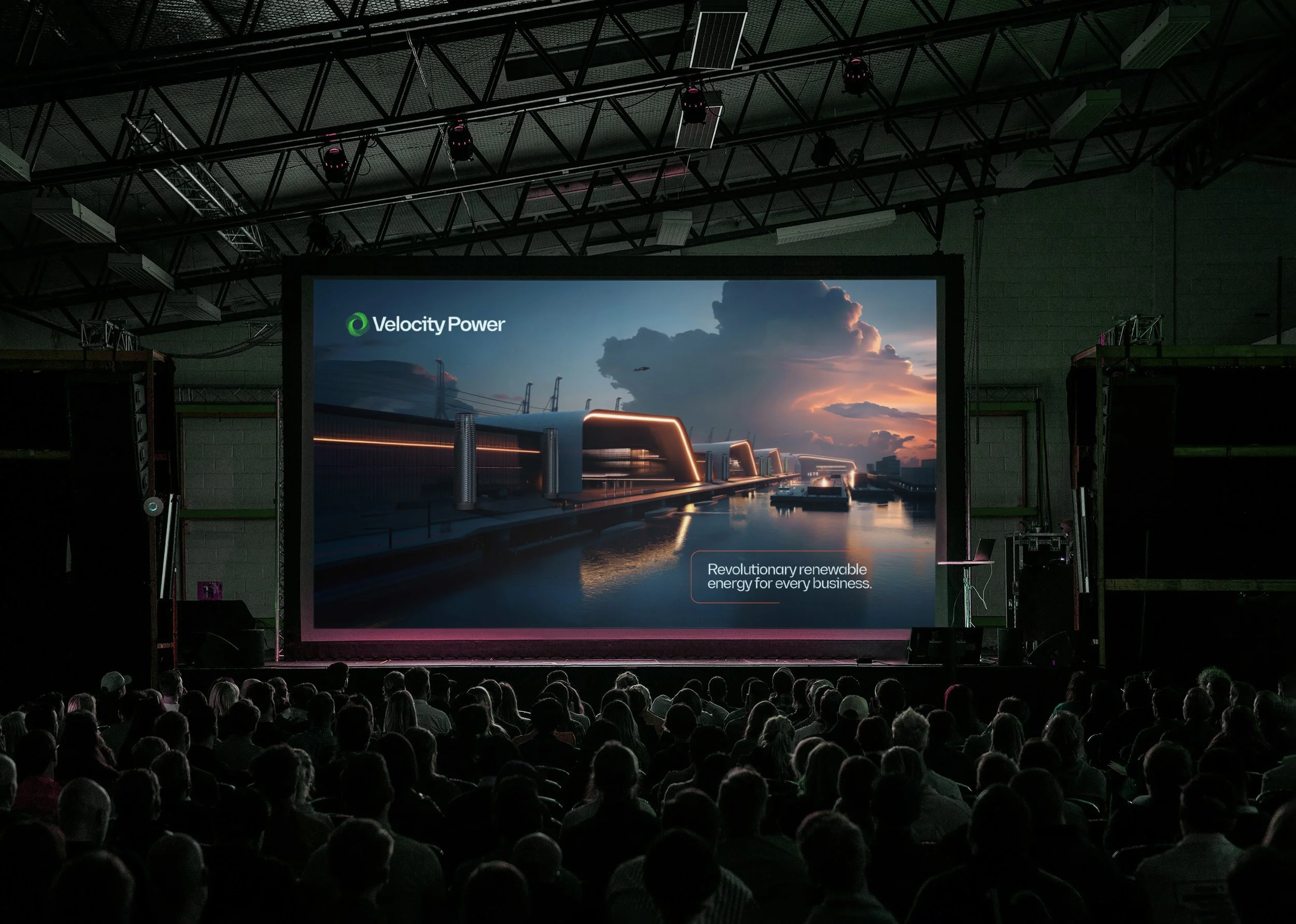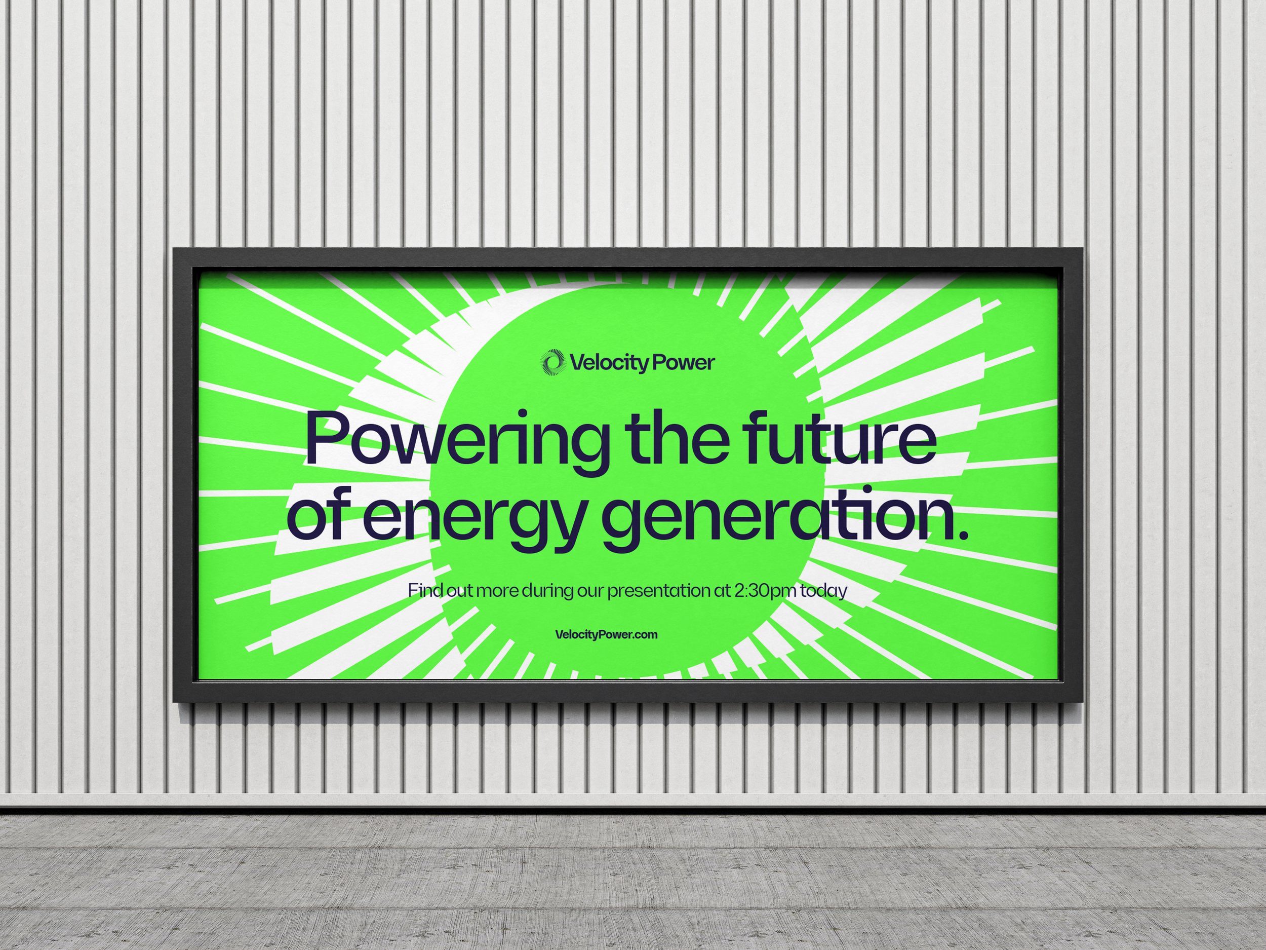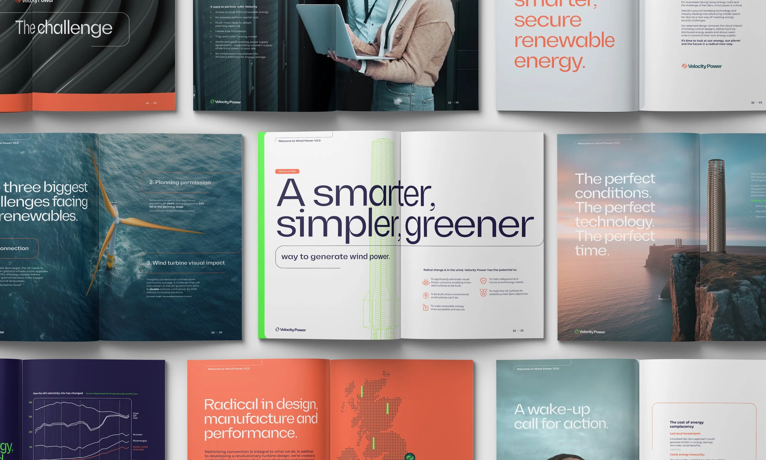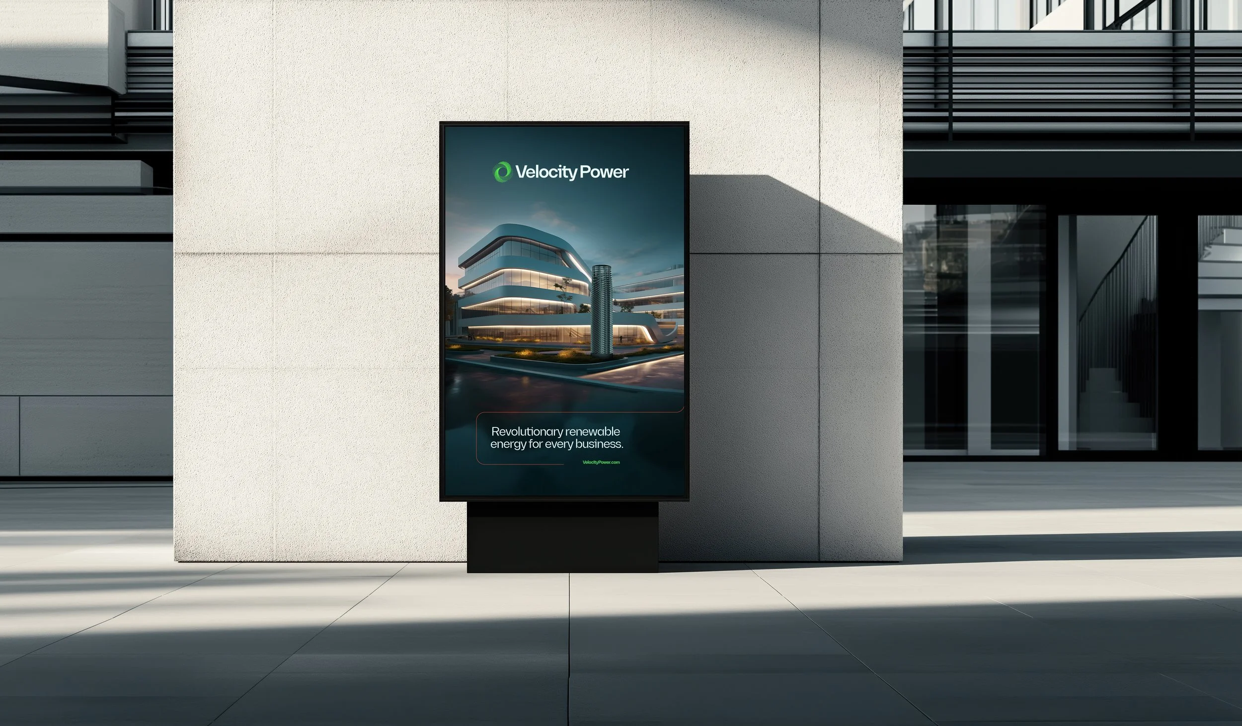 The Velocity Power towers generate energy by utilising wind movement from all 4 directions, this is represented by the Vortex brand mark. This icon also represents the self contained approach to delivering energy with each element feeding into one another.